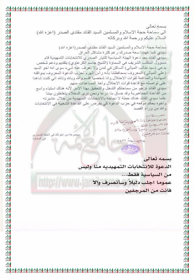 دعوى دعم مسؤول مكتب السيد الشهيد (قدس) في الانتخابات التمهيدية للمدعو طالب الميالي في السماوة استفتاء السيد القائد مقتدى الصدر اعزه الله 8-5-2012