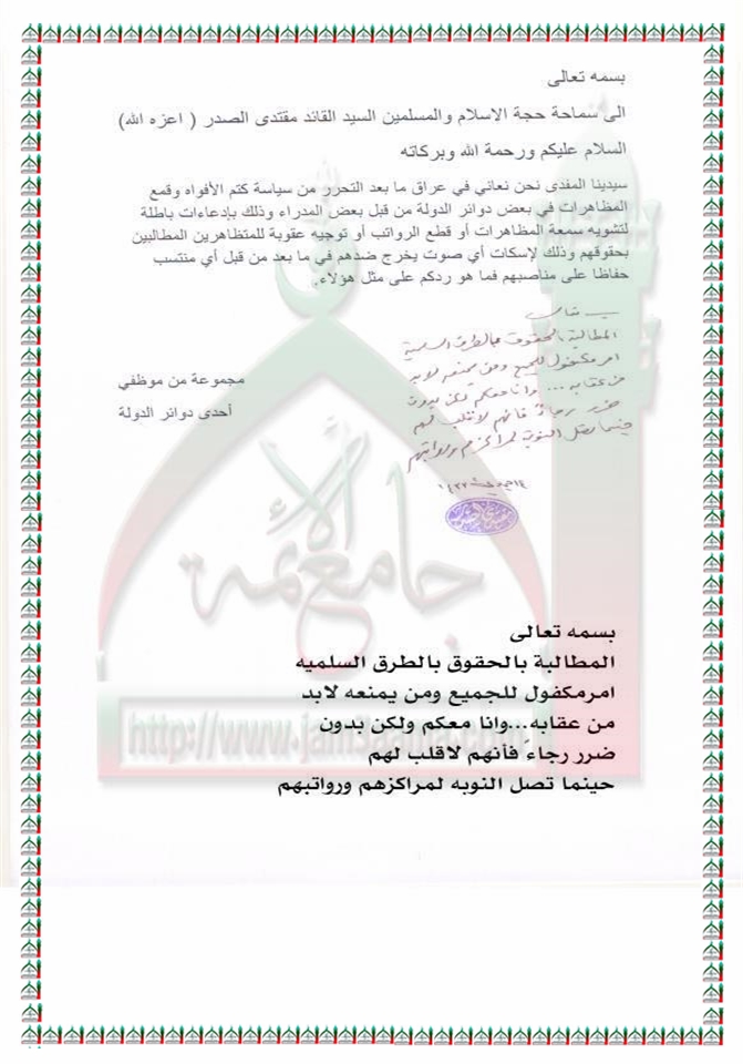 قمع المظاهرات في بعض دوائر الدولة من قبل مدرائها استفتاء السيد القائد مقتدى الصدر اعزه الله 8-5-2012