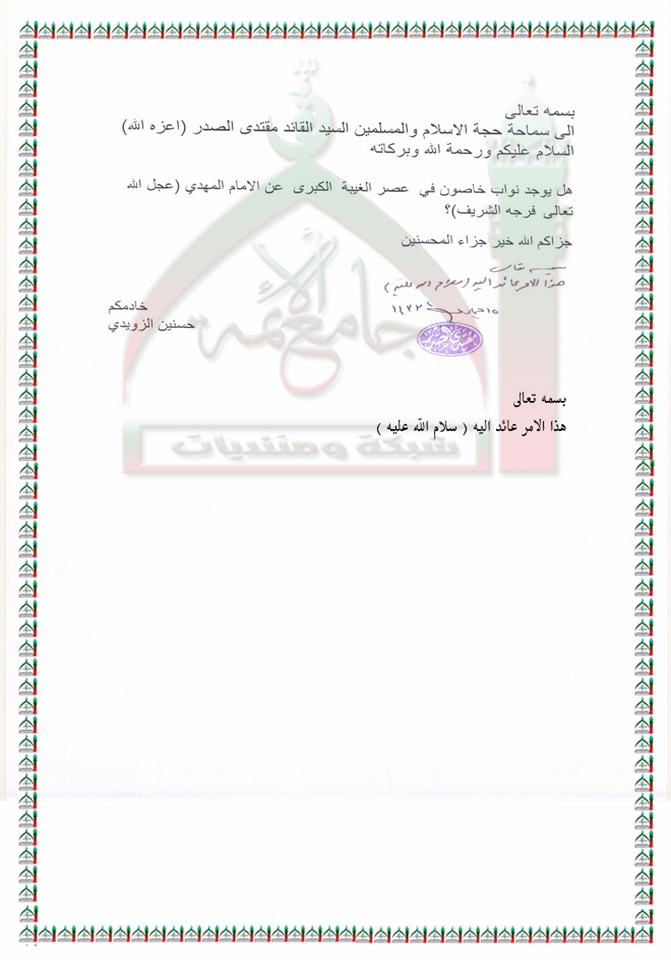 نواب الامام المهدي (ع) في عصر الغيبة الكبرى استفتاء السيد القائد مقتدى الصدر (اعزه الله) 8-5-2012