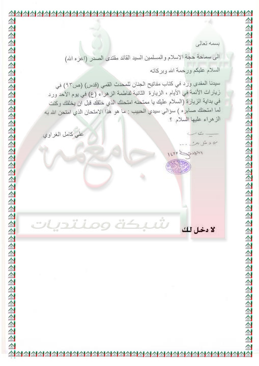 المقصود بالامتحان المذكور في زيارة الزهراء ع "امتحنك الذي خلقك ....." استفتاء السيد القائد مقتدى الصدر اعزه الله 10 - 5 - 2012