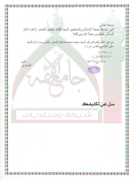 الاعلم بالعرفان !! استفتاء السيد القائد مقتدى الصدر اعزه الله 10 - 5 - 2012