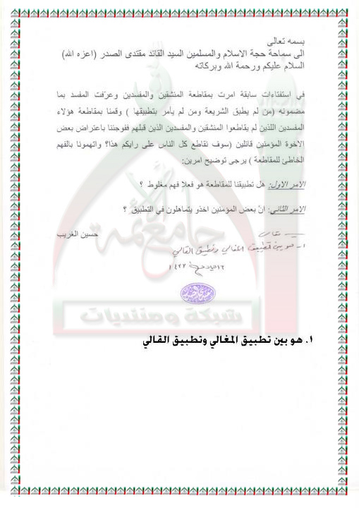 مقاطعة المنشقين والمفسدين استفتاء السيد القائد مقتدى الصدر اعزه الله 10 - 5 - 2012