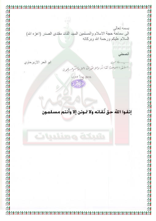 طلب نصيحة من احد المؤمنين استفتاء السيد القائد مقتدى الصدر اعزه الله 10 - 5 - 2012