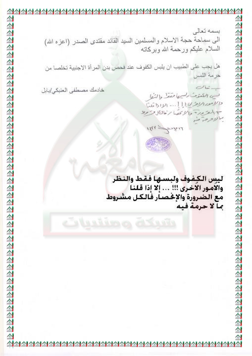 ما يجب على الطبيب عند فحصه للمراة استفتاء السيد القائد مقتدى الصدر اعزه الله 10 - 5 - 2012