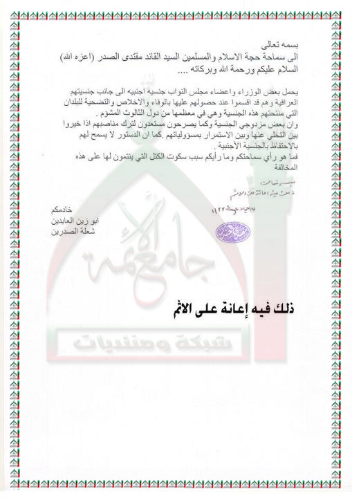 الجنسية المزدوجة عند بعض الوزراء والبرلمانيين استفتاء السيد القائد مقتدى الصدر نصره الله 11 - 5 - 2012