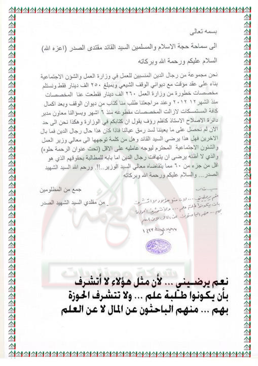 قطع مخصصات المعممين العاملين في وزارة العمل والشؤون الاجتماعية استفتاء السيد القائد مقتدى الصدر نصره الله 11 - 5 - 2012