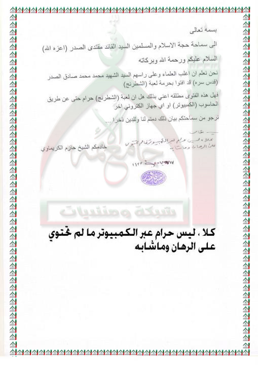 حكم لعب الشطرنج بالكمبيوتر استفتاء السيد القائد مقتدى الصدر نصره الله 11 - 5 - 2012