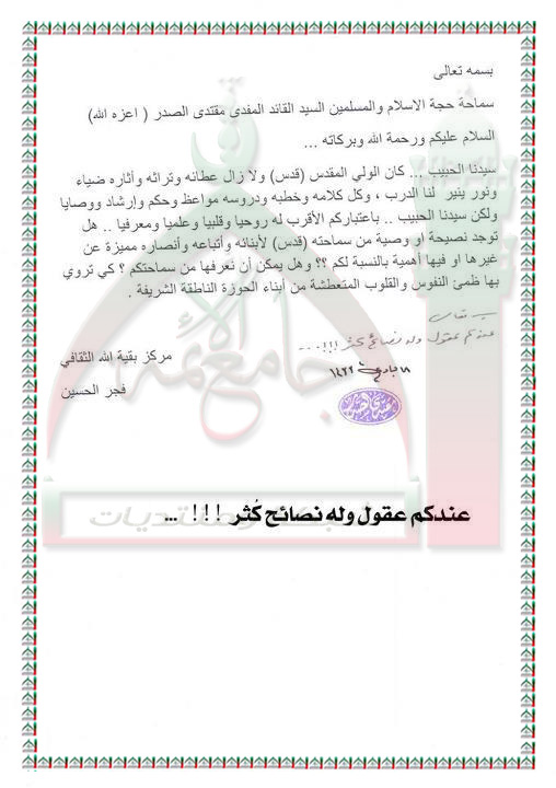 النصيحة او الوصية المميزة للسيد الشهيد محمد الصدر رضوان الله عليه لابناء الحوزة الناطقة استفتاء السيد القائد مقتدى الصدر نصره الله 12 - 5 - 2012