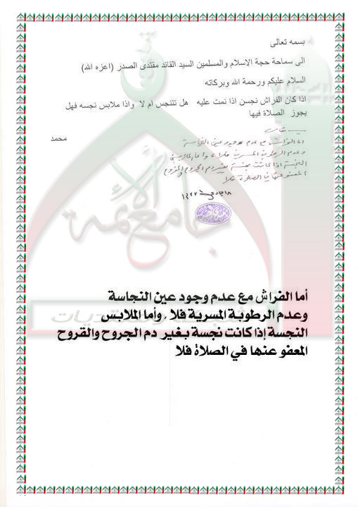 مسائل في الطهارة استفتاء السيد القائد مقتدى الصدر نصره الله 12 - 5 - 2012