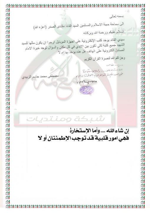 استخارة الامام الصادق ومؤلفات السيد الشهيد في اجهزة الموبايل استفتاء السيد القائد مقتدى الصدر نصره الله 12 - 5 - 2012