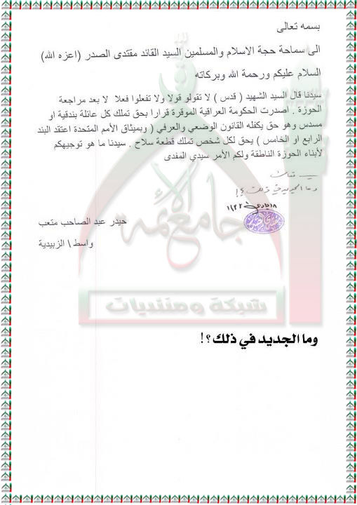 قرار الحكومة بالسماح للمواطنين بتملك الاسلحة استفتاء السيد القائد مقتدى الصدر نصره الله 12 - 5 - 2012