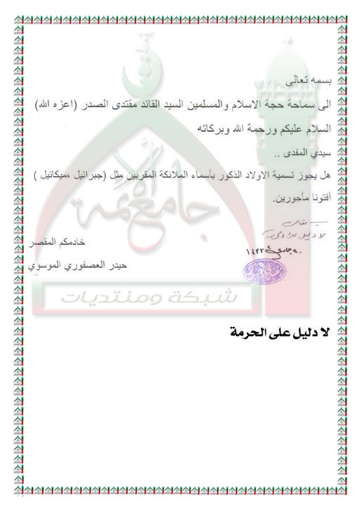 تسمية الاولاد باسماء الملائكة استفتاء السيد القائد مقتدى الصدر اعزه الله 13 - 5 - 2012