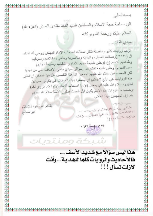 الغاية من ذكر مواصفات واحوال اصحاب الامام المهدي عليه السلام ال 313 استفتاء السيد القائد مقتدى الصدر اعزه الله 13 - 5 - 2012