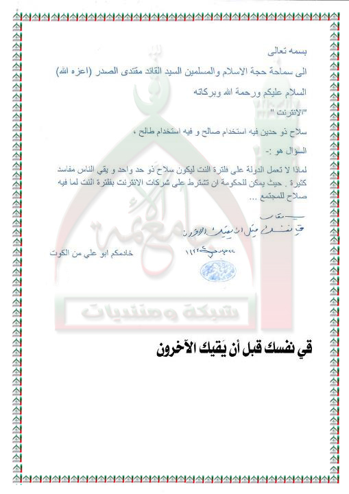 قيام الدولة بفلترة الانترنيت استفتاء السيد القائد مقتدى الصدر اعزه الله 14 - 5 - 2012
