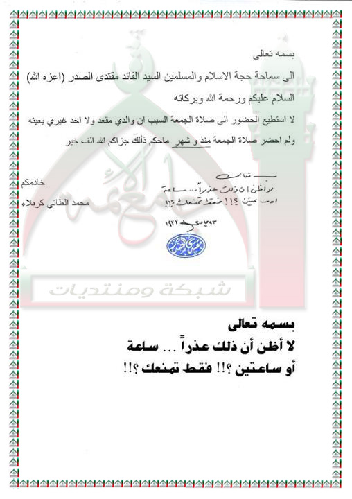 التعذر عن عدم حضور صلاة الجمعة استفتاء السيد القائد مقتدى الصدر اعزه الله 15 - 5 - 2012