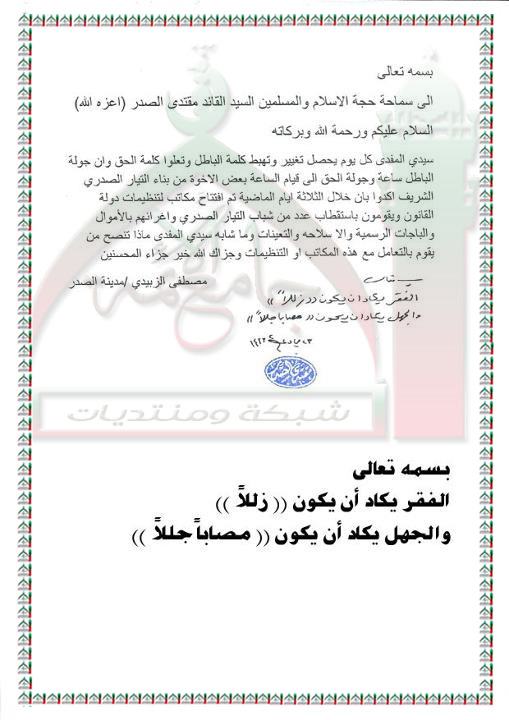 محاولة استقطاب مكاتب دولة القانون للسذج من ابناء الخط الصدري الشريف واغرائهم بالاموال والتعيينات استفتاء السيد القائد مقتدى الصدر اعزه الله 15 - 5 - 2012