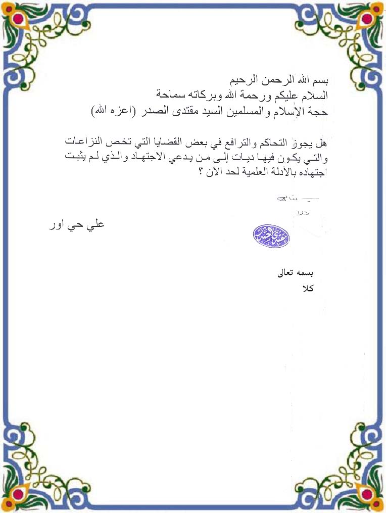 لايجوز الترافع الى مدّعي الاجتهاد(استفتاء للسيد القائد بتاريخ 10-2-2011)