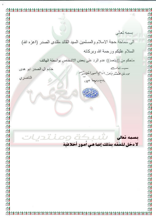 حكم تعمد عدم الرد على الهاتف استفتاء السيد القائد مقتدى الصدر اعزه الله 16 - 5 - 2012