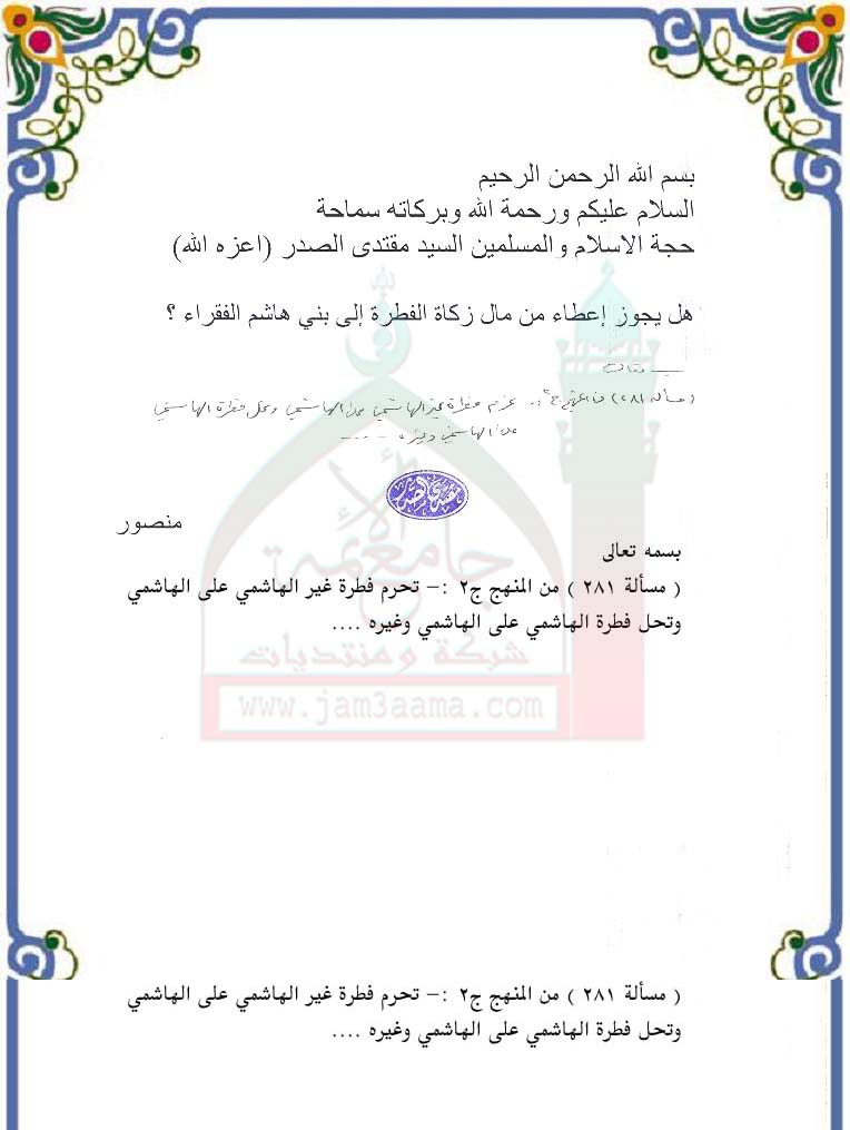 تحرم فطرة غير الهاشمي على الهاشمي(استفتاء للسيد القائد بتاريخ 10-2-2011)