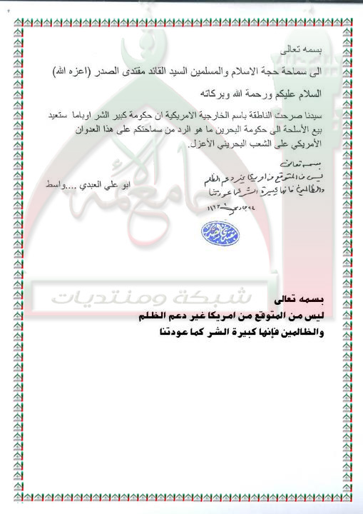 قيام امريكا ببيع الاسلحة للطغمة الحاكمة في البحرين استفتاء السيد القائد مقتدى الصدر اعزه الله 16 - 5 - 2012