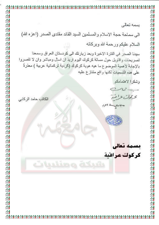 هوية كركوك عراقية استفتاء السيد القائد مقتدى الصدر اعزه الله 17 - 5 - 2012
