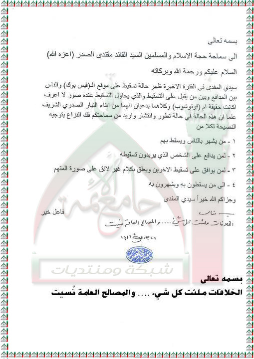 الخلافات والتشهير على صفحات الفيسبوك استفتاء السيد القائد مقتدى الصدر اعزه الله 18 - 5 - 2012