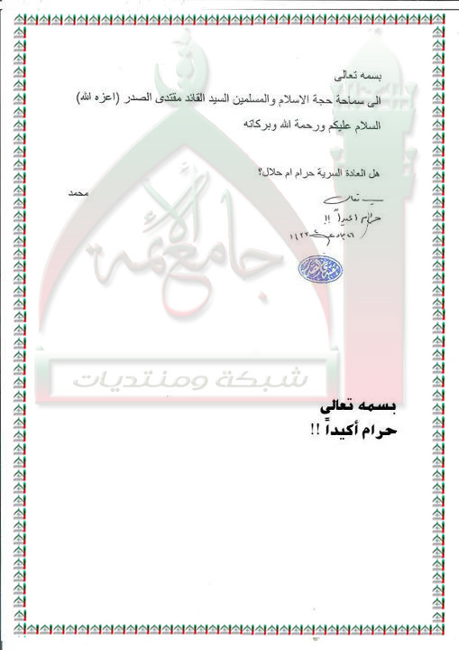 حرمة الاستمناء استفتاء السيد القائد مقتدى الصدر اعزه الله 18 - 5 - 2012