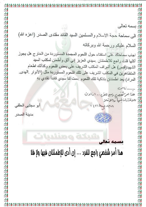 تناول الدجاج المستورد استفتاء السيد القائد مقتدى الصدر اعزه الله 18 - 5 - 2012