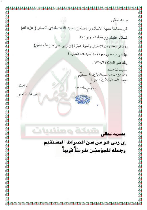معنى فقرة " ان ربي على صراط مستقيم " الواردة في بعض الاحراز استفتاء السيد القائد مقتدى الصدر اعزه الله 19 - 5 -2012