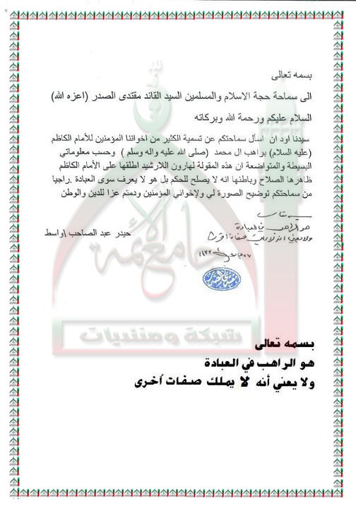 سبب تسمية الامام الكاظم عليه السلام براهب ال محمد استفتاء السيد القائد مقتدى الصدر اعزه الله 19 - 5 -2012