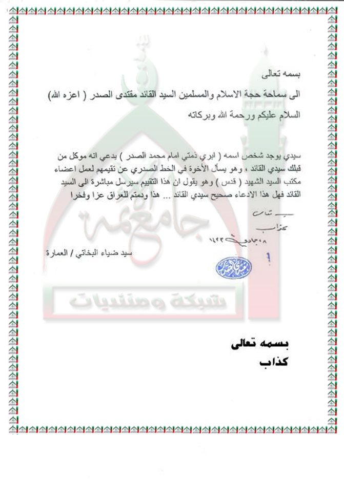 المدعو " ابرىء ذمتي امام السيد محمد الصدر " في صفحات الفيسبوك كذّاب استفتاء السيد القائد مقتدى الصدر اعزه الله 21 - 5 - 2012
