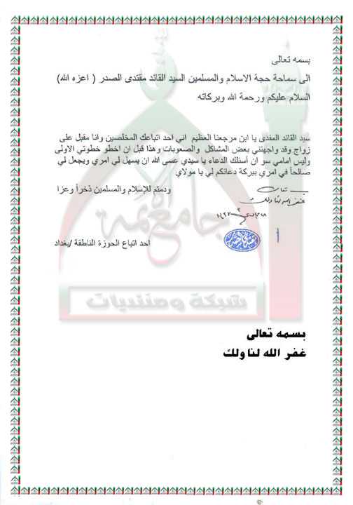 طلب دعاء لتسهيل الزواج استفتاء السيد القائد مقتدى الصدر اعزه الله 21 - 5 - 2012