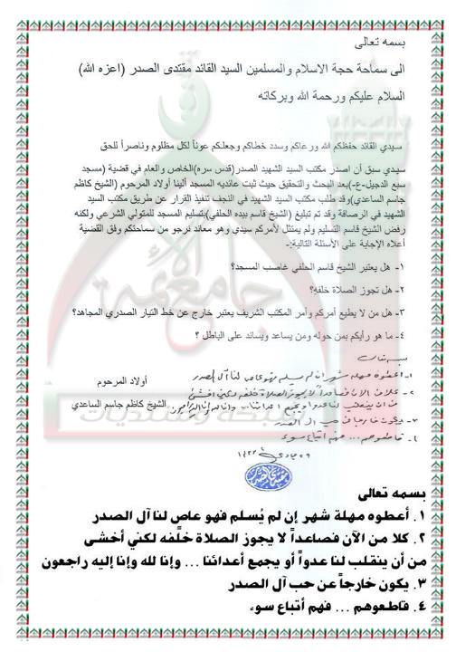 الشيخ قاسم بيده الحلفي واعطاءه مهلة شهر لتسليم مسجد سبع الدجيل الى اصحابه الشرعيين استفتاء السيد القائد مقتدى الصدر اعزه الله 21 - 5 - 2012