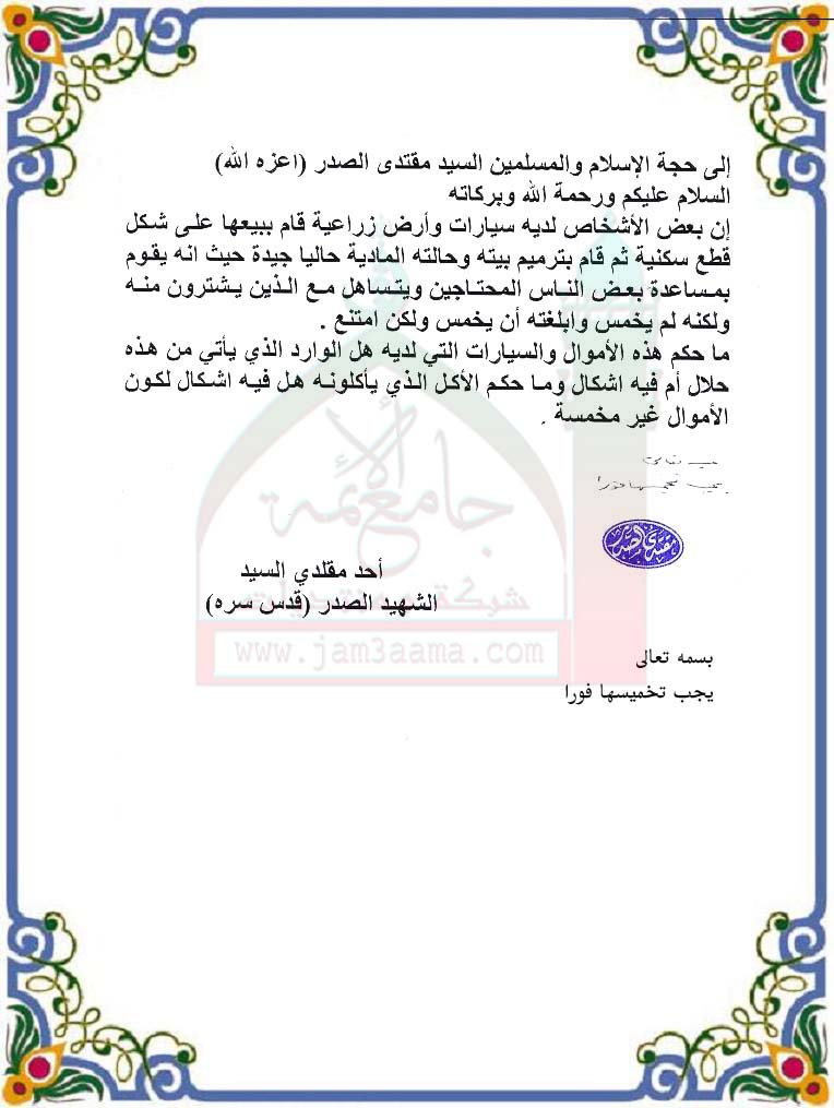 تخميس الاموال والسيارات(استفتاء للسيد القائد بتاريخ 11-2-2011)