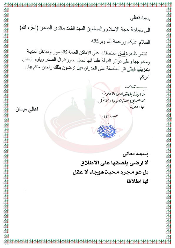 ظاهرة لصق صور ال الصدر الكرام في الاماكن العامة استفتاء السيد القائد مقتدى الصدر اعزه الله 25 - 5 - 2012