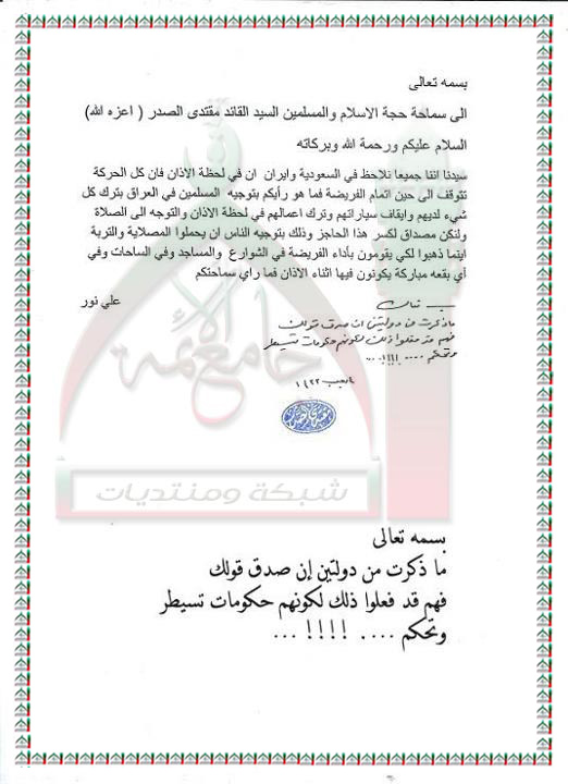 ترك الأعمال وقت الصلاة في إيران والسعودية استفتاء السيد القائد مقتدى الصدر نصره الله 26 - 5 - 2012