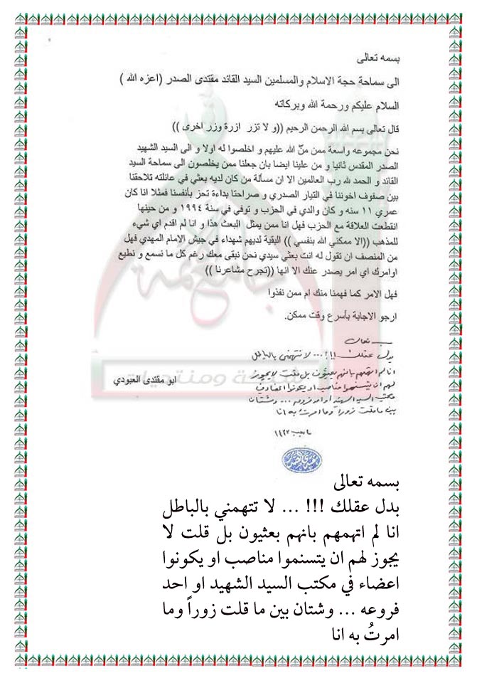 من لديهم بعثي لا يجوز لهم ان يتسنموا مناصب او يكونوا اعضاء في المكتب الشريف استفتاء السيد القائد مقتدى الصدر نصره الله 26 - 5 - 2012