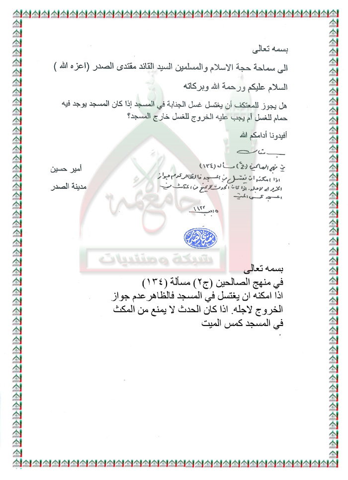 جواز الغسل داخل المسجد للمعتكفين اذا كان الحدث لا يمنع من المكث كمس الميت استفتاء السيد القائد مقتدى الصدر نصره الله 27 - 5 - 2012