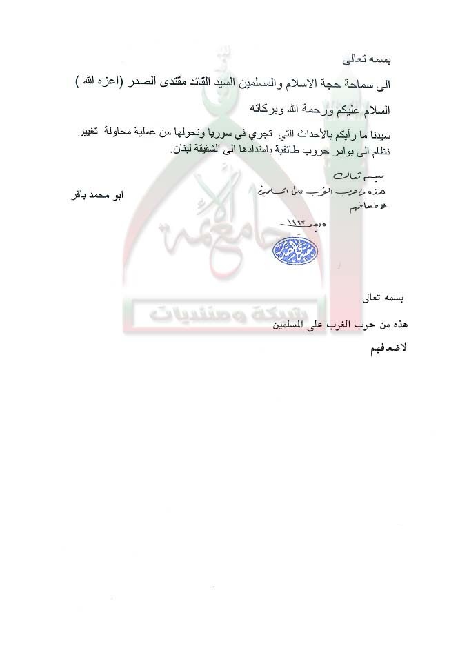الاحداث التي تجري في سوريا وبوادر نشوب حرب طائفية في المنطقة استفتاء السيد القائد مقتدى الصدر نصره الله 28 - 5 - 2012