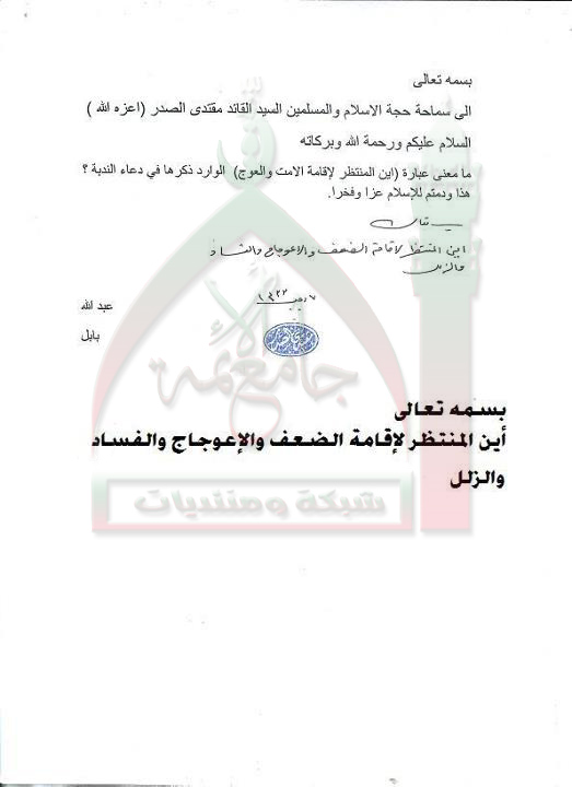 معنى عبارة ـ أين المنتظر لإقامة الأمت والعوج ـ استفتاء السيد القائد مقتدى الصدر اعزه الله 30 - 5 - 2012