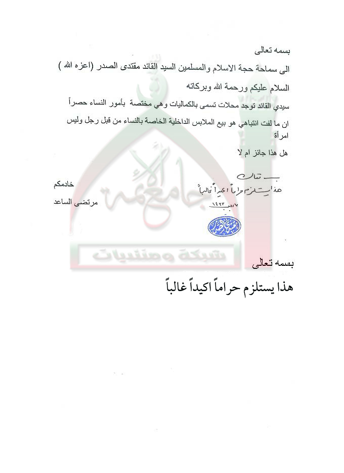 بيع الملابس النسائية من قبل الرجال استفتاء السيد القائد مقتدى الصدر اعزه الله 31 - 5 - 2012