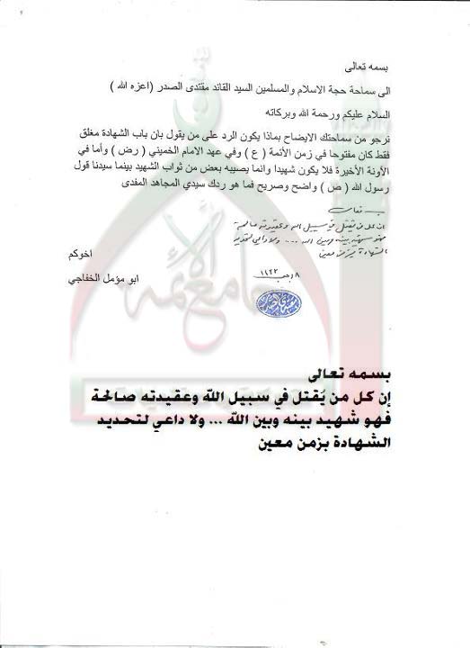 الشهادة وتحديدها بزمن معين استفتاء السيد القائد مقتدى الصدر اعزه الله 31- 5 - 2012