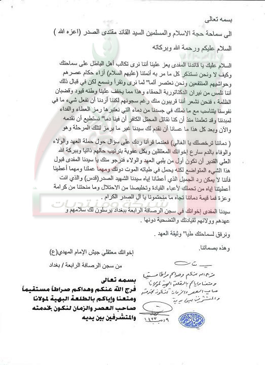 عهد معتقلي جيش الإمام المهدي عليه السلام في سجن الرصافة الرابعة استفتاء السيد القائد مقتدى الصدر اعزه الله 1 - 6 - 2012