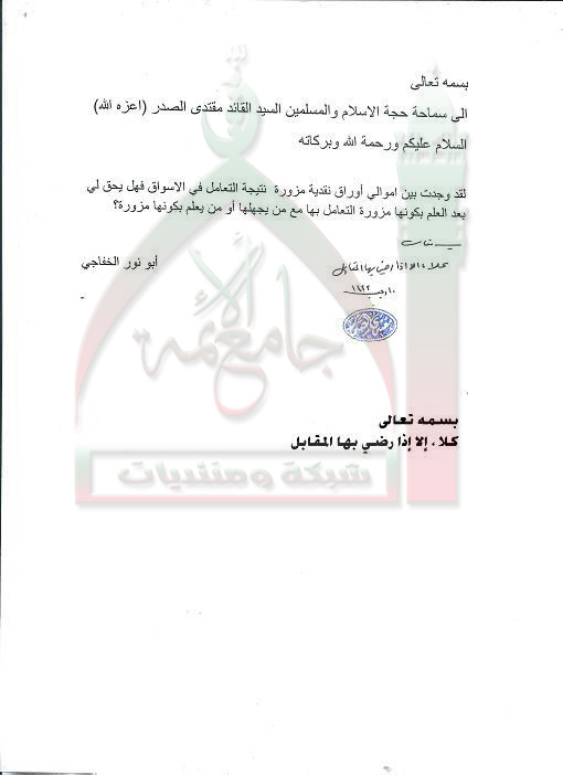 التعامل بالأموال المزورة استفتاء السيد القائد مقتدى الصدر اعزه الله 2 - 6 - 2012