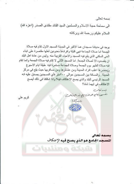المسجد الذي يصح فيه الإعتكاف استفتاء السيد القائد مقتدى الصدر اعزه الله 2 - 6 - 2012