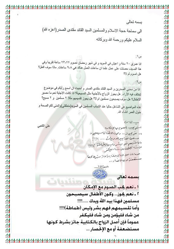 امكانية الصوم 22-23 ساعة في نهار السويد وحكم الزواج من امرأة مسيحية استفتاء السيد مقتدى الصدر 3-6-2012