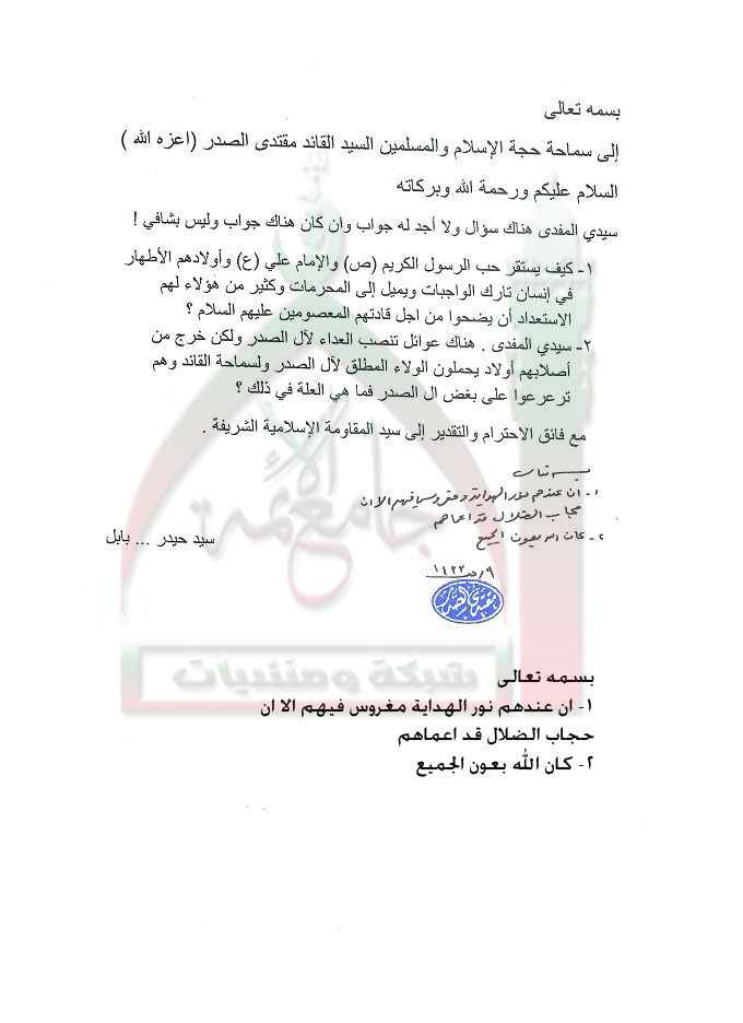 الموالين للأئمة الاطهار التاركين للواجبات استفتاء السيد القائد مقتدى الصدر اعزه الله 3 - 6 - 2012