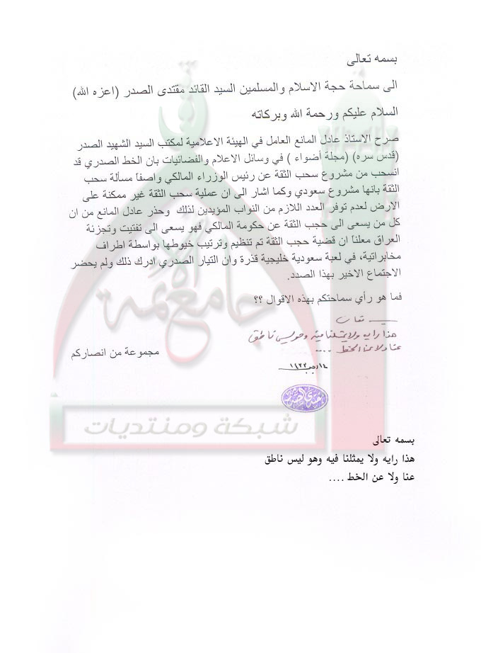 تصريح احد الاعلاميين الصدريين بان التيار الصدري قد انسحب من مشروع سحب الثقة من المالكي استفتاء السيد القائد مقتدى الصدر اعزه الله 5 - 6 - 2012
