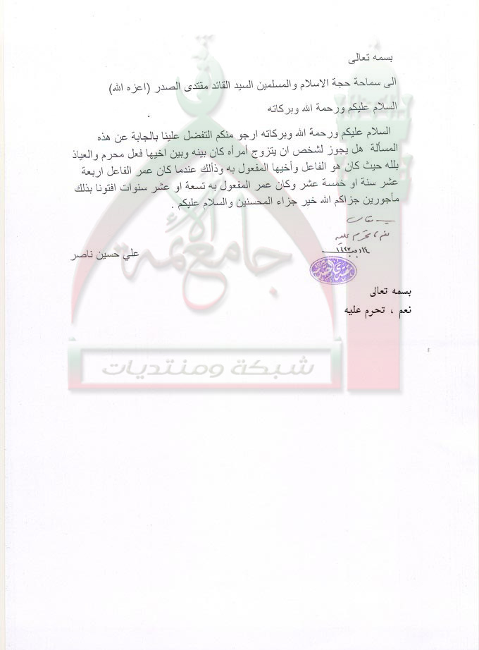 الزواج المحرم استفتاء السيد القائد مقتدى الصدر اعزه الله 5 - 6 - 2012