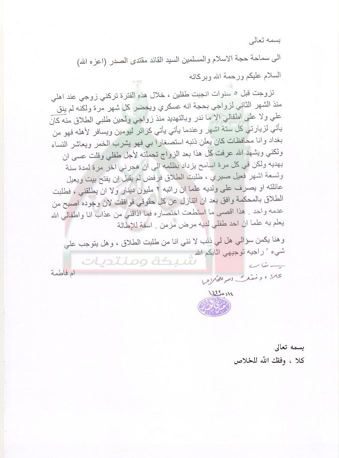 زوج ترك زوجته بعد شهر من زواجهما وطلب الطلاق منه استفتاء السيد القائد مقتدى الصدر اعزه الله 5 - 6 - 2012